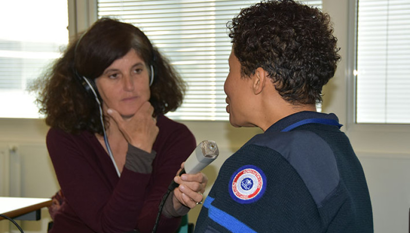 Depuis le début de sa résidence, une semaine tous les deux mois, Katia Kovacic a installé son micro aux quatre coins de l’école. Elle a enregistré une vingtaine d’élèves individuellement et capté de nombreux moments de la vie du campus. Ces enregistrements donnent la parole aux élèves, qui livrent des témoignages sur la formation qu’ils vivent en temps réel. Toujours dans une volonté de rencontre et d’échange entre l’artiste en résidence et les élèves, formateurs et personnels de l’école, nous avons accompagné Katia dans ses recherches et observations.