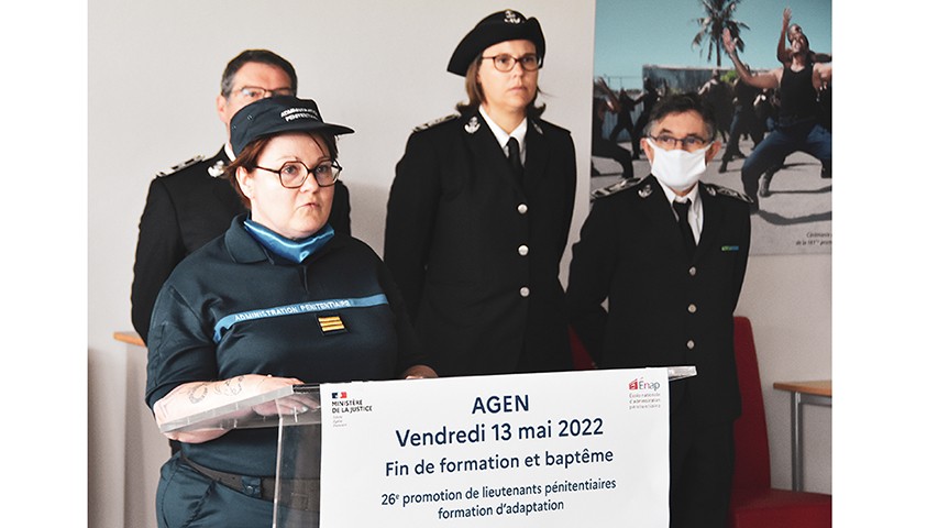 Vendredi 13 mai 2022 étaient réunis la 26e promotion de lieutenants pénitentiaires issus de la formation d’adaptation pour clôturer leur formation, en présence des membres de la direction de l’École, de l’unité de formation des cadres des personnels de surveillance, et des personnels de l’École. La promotion était composée de 6 femmes et 19 hommes, 24 officiers issus de l’examen professionnel et un officier issu de la liste d’aptitude.