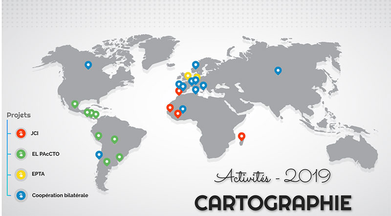 L’Énap a ainsi collaboré avec plus d’une centaine de pays depuis son implantation à Agen. En 2019, la diversité et l’étendue des actions de coopération internationale de l’Énap ont été illustrées par une cartographie.