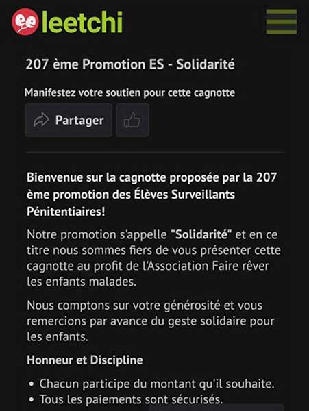« La 207e promotion a été baptisée "Solidarité" et à ce titre, nous nous devions de joindre les actes à la parole. En ce sens nous avons créé une cagnotte Leetchi et nous verserons l'intégralité des fonds à l'association "Faire rêver les enfants malades" située à Agen. »
