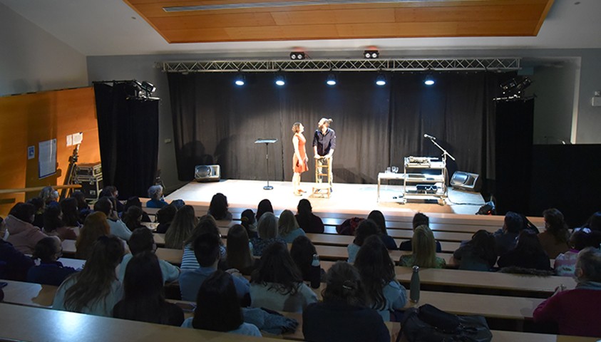 Le spectacle « Faut s’tenir » par La D’âme de Compagnie a été proposée à un public constitué d’élèves et de personnels de l’Énap, dans le cadre de la journée internationale des droits des femmes et des actions de sensibilisation à l’égalité professionnelle femmes/hommes menées à l’École. Valérie Lardoeyt, déléguée départementale aux droits des femmes et à l’égalité, était également présente. S’appuyant sur son expérience de bénévole au planning familiale et sur son militantisme féministe, Chloé Martin, autrice et interprète du spectacle, retrace un parcours de vie, avec ses étapes à digérer, de celles qui nous construisent. Elle partage la scène avec KLOVIS, qui crée en direct l’univers sonore de la pièce. Avec humour et justesse, le duo aborde les injonctions à la féminité et à la masculinité imposées par la société, notre capacité à dénoncer, lorsque nous sommes victimes ou témoins, la culpabilité aussi, quand nous choisissons de ne rien dire. Il questionne également le consentement, l’état de sidération et la libération de la parole. Au terme de la représentation, les comédiens ont prolongé la réflexion avec le public, interrogeant leur responsabilité, tant individuellement que collectivement.