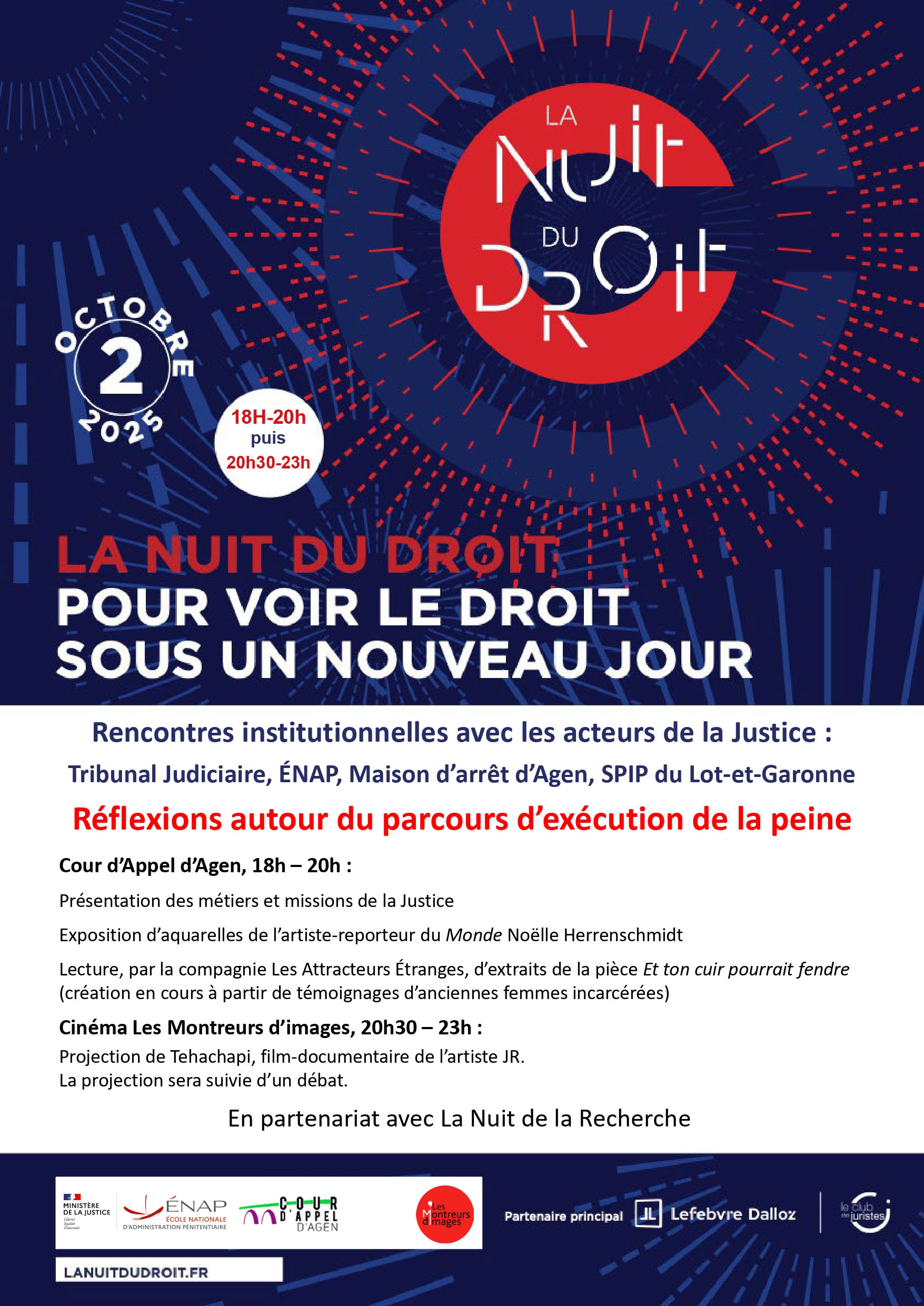 En lien avec la Cour d'Appel d'Agen, le SPIP et la maison d'arrêt d'Agen, et le cinéma les Montreurs d'images, l'ENAP participera à l'édition de LA Nuit du Droit le 02 octobre 2025