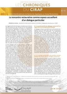 Ce numéro des Chroniques du CIRAP revient sur la première expérimentation des Rencontres Détenus-Victimes (RDV) réalisée en 2010 à la Maison centrale de Poissy en partenariat avec l’INAVEM (Institut national d’aide aux victimes et de médiation), le Service pénitentiaire d’insertion et de probation (SPIP) des Yvelines et l’Enap (Département de la recherche). En effet, les rencontres restauratives post-sentencielles qui ont vu le jour dans les années 1980 en Amérique du Nord arrivent progressivement en France. Elles concernent généralement les infractions les plus graves. C’est la modalité des rencontres Détenus-Victimes qui est aujourd’hui retenue. Elle permet à des victimes de rencontrer durant cinq à six séances, dans une démarche d’intercompréhension, sous la responsabilité des animateurs formés à la médiation et en présence des représentants de la communauté, des détenus ayant commis les mêmes faits que ceux qu’elles ont subis (protagonistes substituts). Ce numéro spécial des Chroniques du CIRAP restitue le difficile cheminent ainsi que les bénéfices variables des victimes et détenus ayant participé à cette expérimentation.