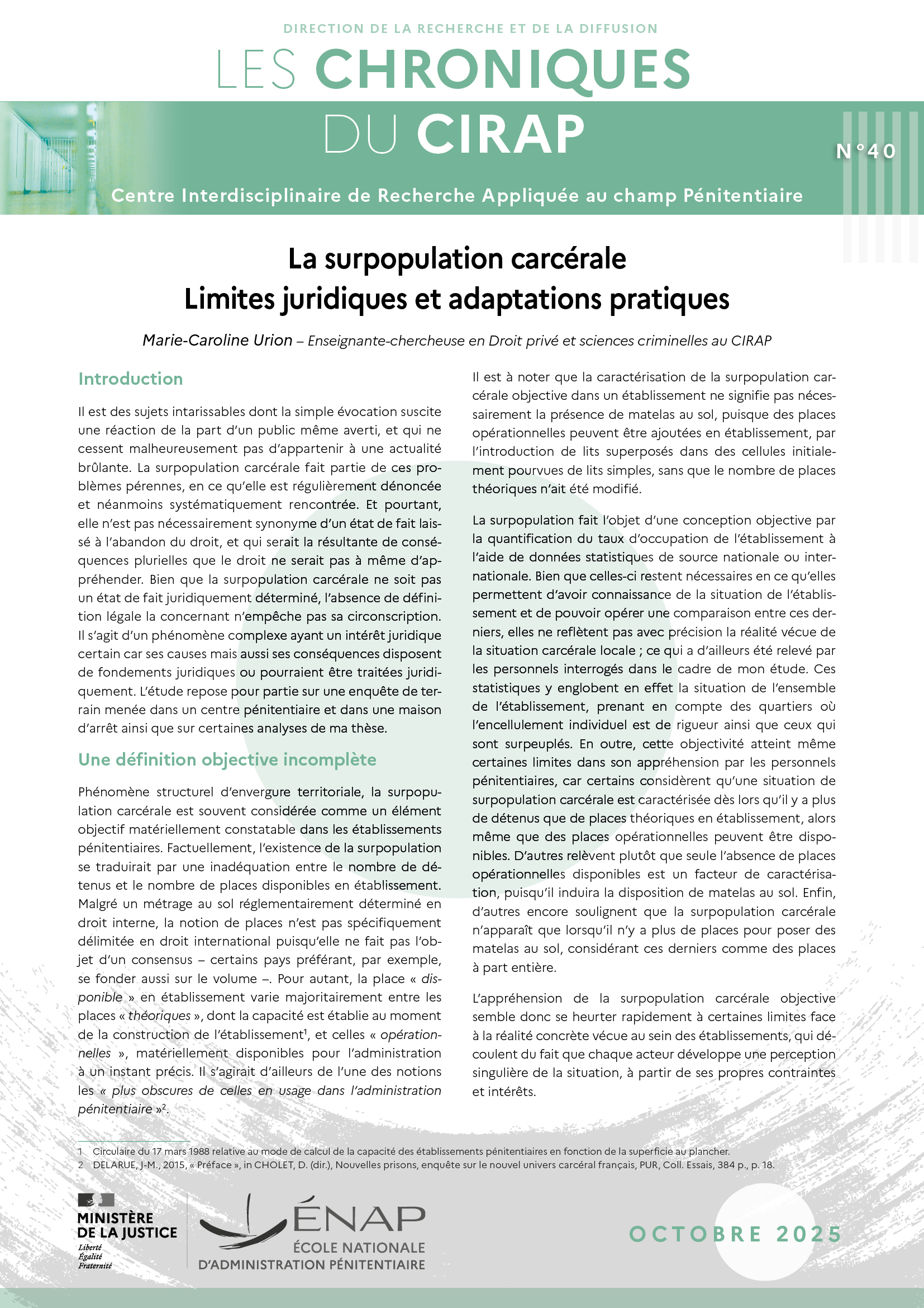 Cette chronique s’intéresse aux relations entre la surpopulation carcérale et son appréhension juridique, et examine en quoi ce phénomène persistant et régulièrement dénoncé soulève des enjeux majeurs. L’étude met ainsi en lumière les différentes limites du cadre légal actuel, tout en soulignant la nécessité, pour les acteurs du champ pénitentiaire, d’adapter leurs pratiques dans leur gestion quotidienne de cette surpopulation. Elle montre que ce phénomène peut être appréhendé au travers de différents prismes – objectif et subjectif –, et que seul le droit pourra définitivement le réguler.